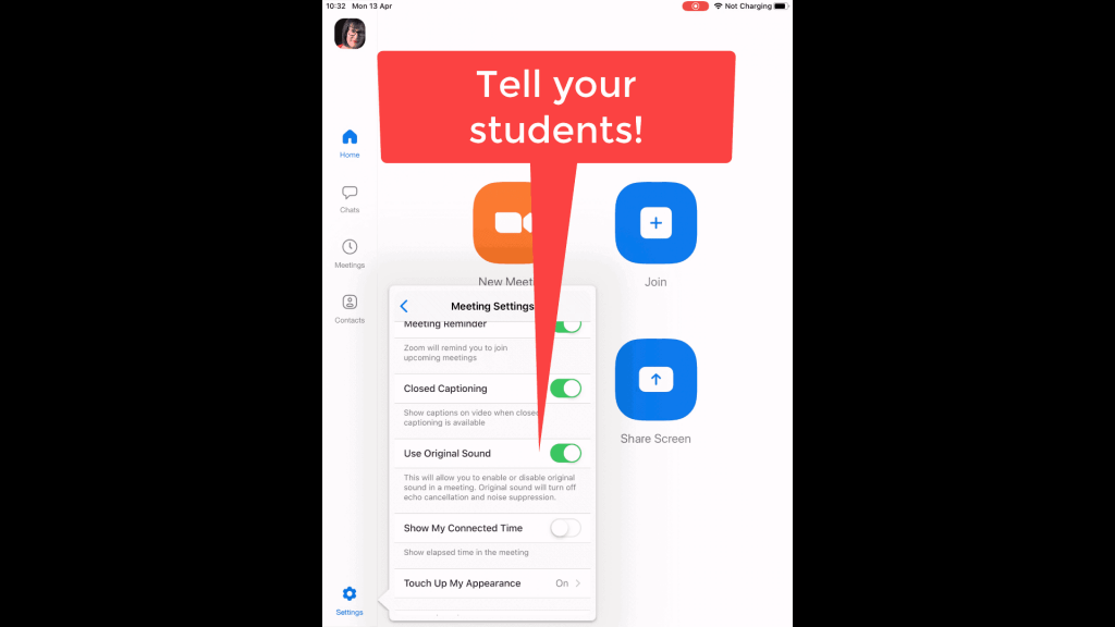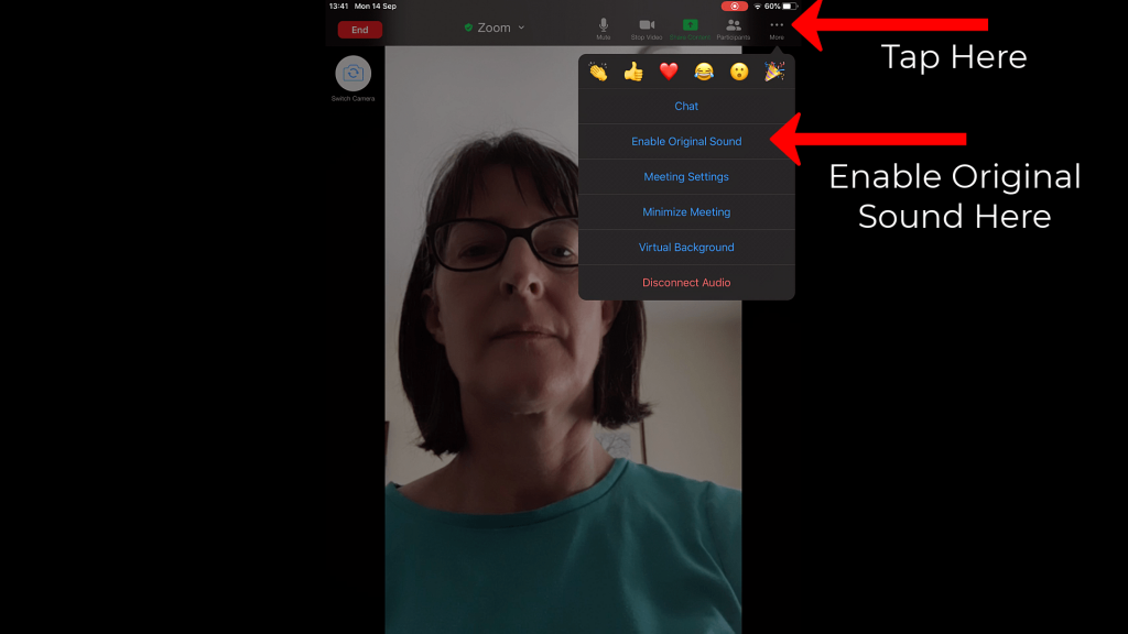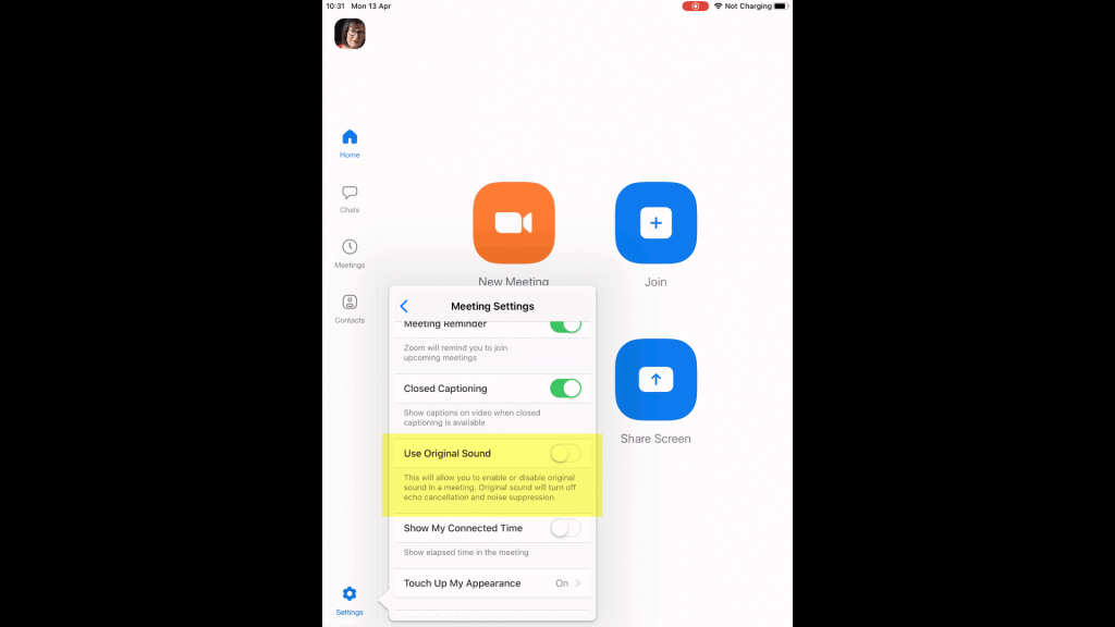 Scroll down through the Meeting Settings to the option to “Use Original Sound”, and slide on to activate. The mobile device will then turn off the noise cancellation settings that disrupt audio.