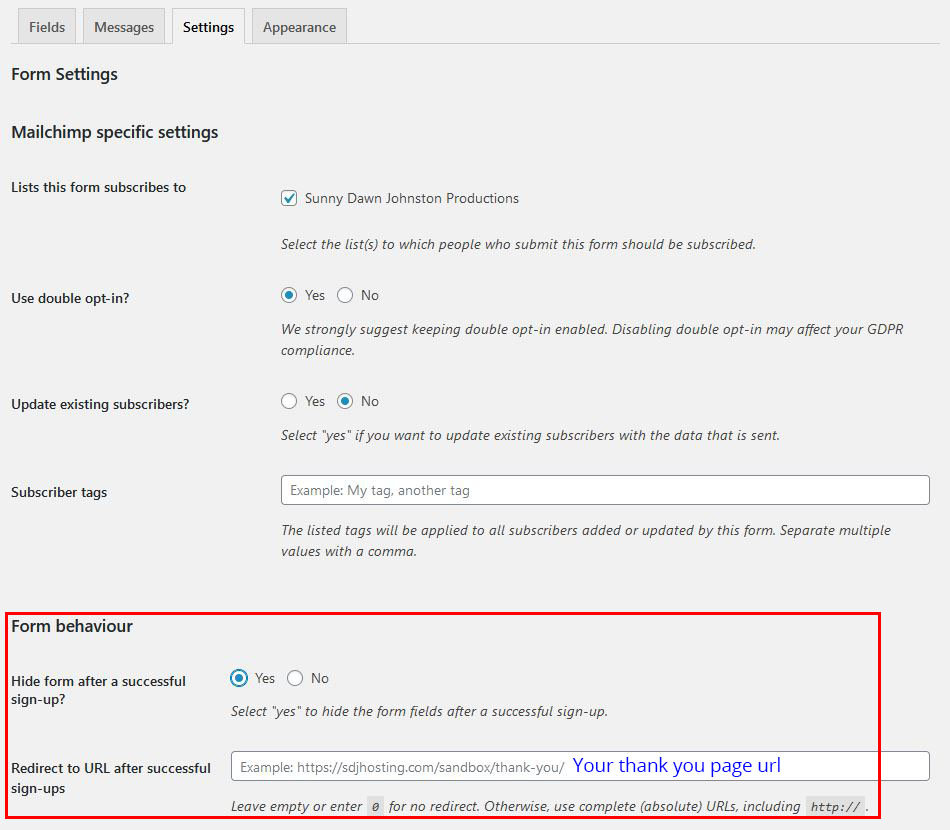 - Scroll down to the Form behavior section and check the YES radio button under Hide form after a successful sign up?
