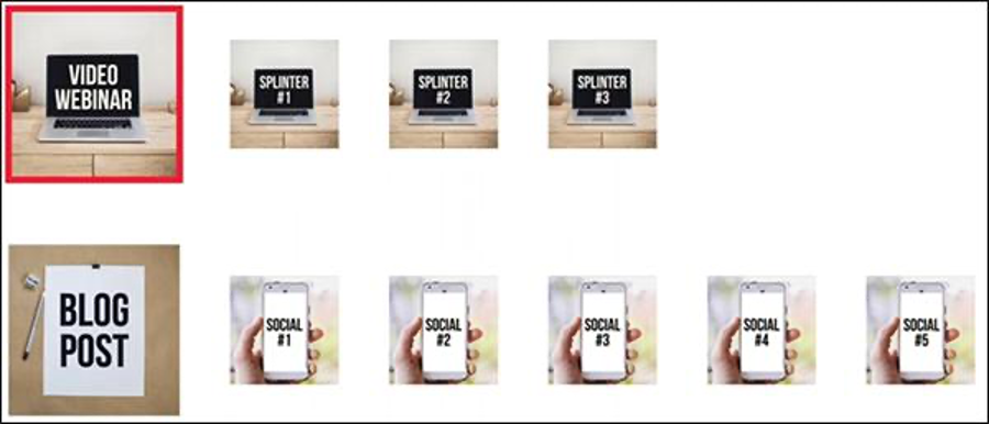 - Splintering: This is my favorite part of this system. It’s the process of taking 1 great piece of content and turning it into multiple different assets that you can leverage on all your different content platforms.
