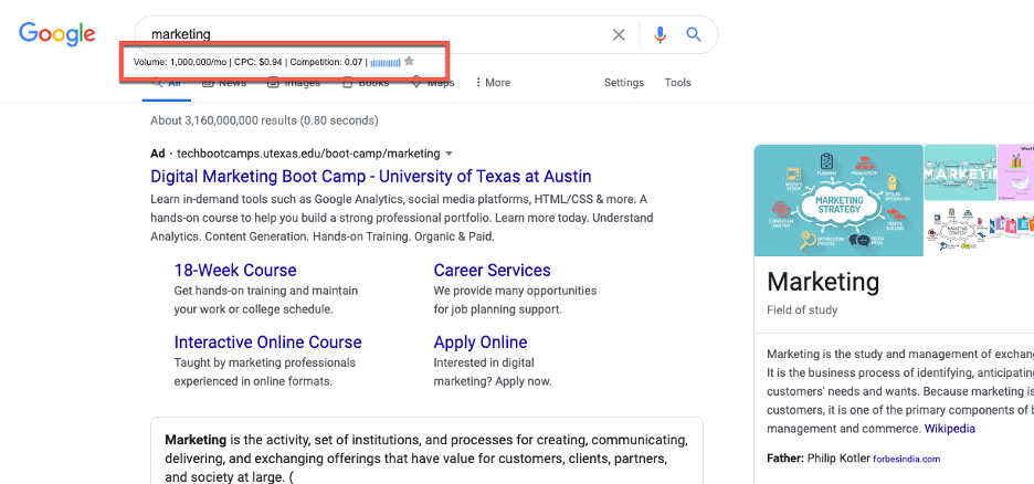 Using a keyword research tool (like Keywords Everywhere or SEMrush), you can find the search volume for the questions that you discovered above. When you search in Google, the Keywords Everywhere Chrome browser extension will show approximately how many searches are being performed every month for your searched term: