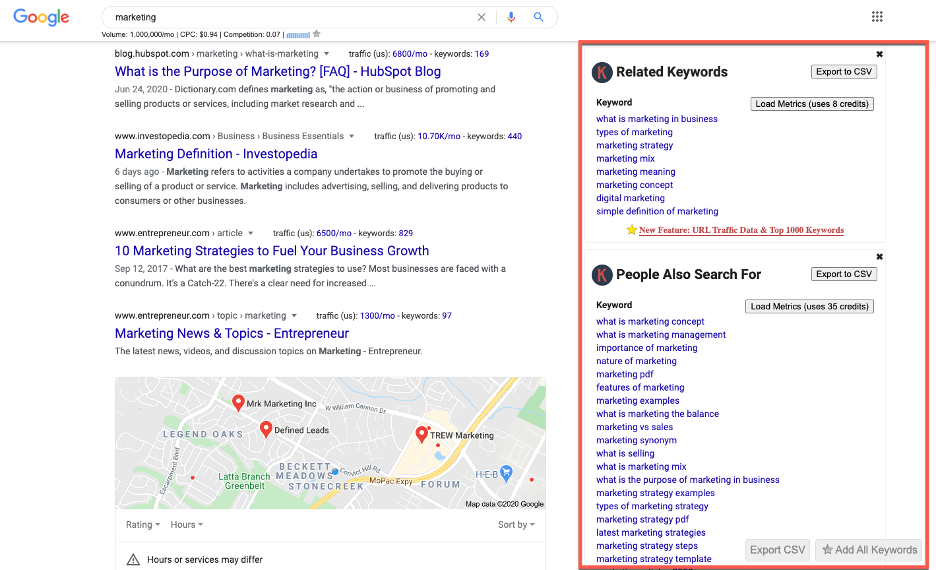 You can also use the Keywords Everywhere to find new keyword ideas that are related to your existing keywords. Just scroll down and it will give you related keywords and other searches people make about that topic: