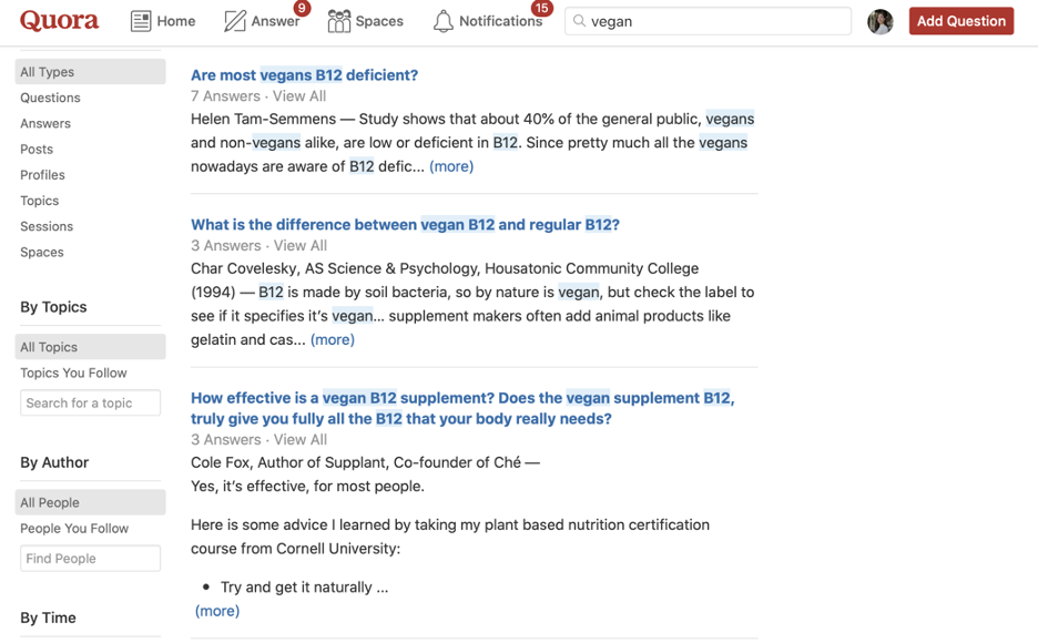 Let’s look for the questions people are asking about veganism on Quora. Search “Vegan” on Quora and here are a few responses you’ll see: